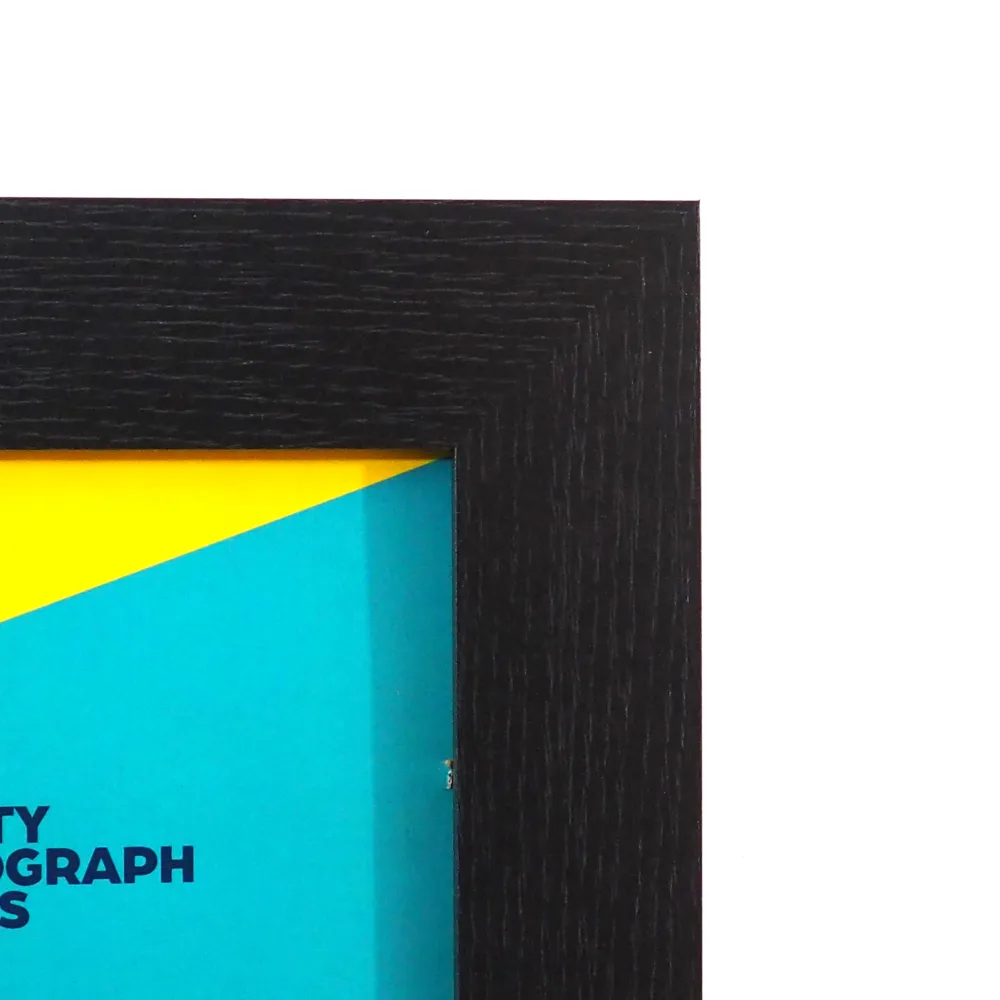 MDF frame in Black woodgrain. 40mm wide, 30mm deep. Fitted with 2mm glass or 1mm perspex and an MDF back. Quality frames made in the UK. THESE FRAMES ARE NOW SUPPLIED WITH BACKS WITH FIXED HANGERS ON ALL SIZES SO WILL HANG ONLY